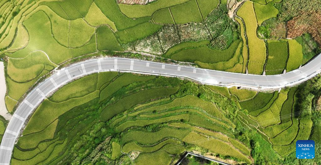 E-mail Xinhua, August 28, 2022Aerial Photo taken on Aug. 27, 2022 shows the view of paddy fields in Matou Village of Hefeng Township, Kaiyang County in Guiyang, capital city of southwest China's Guizhou Province. (Xinhua/Yang Ying)