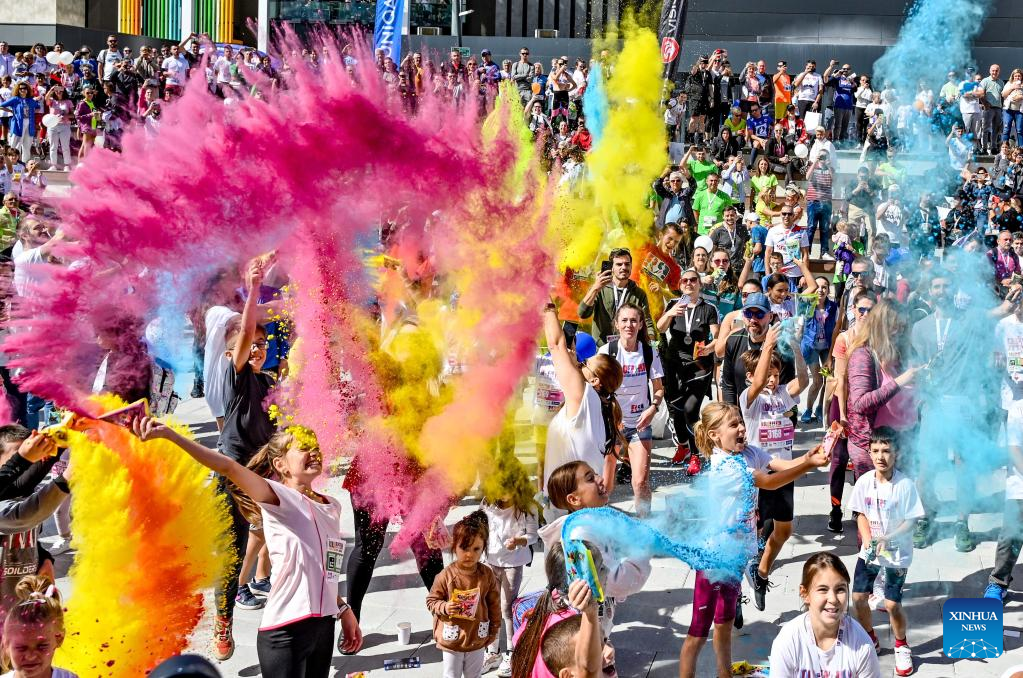 People throw color and dance after they finished the color run in Skopje, North Macedonia, Sept. 18, 2022. [Photo by Tomislav Georgiev/Xinhua]