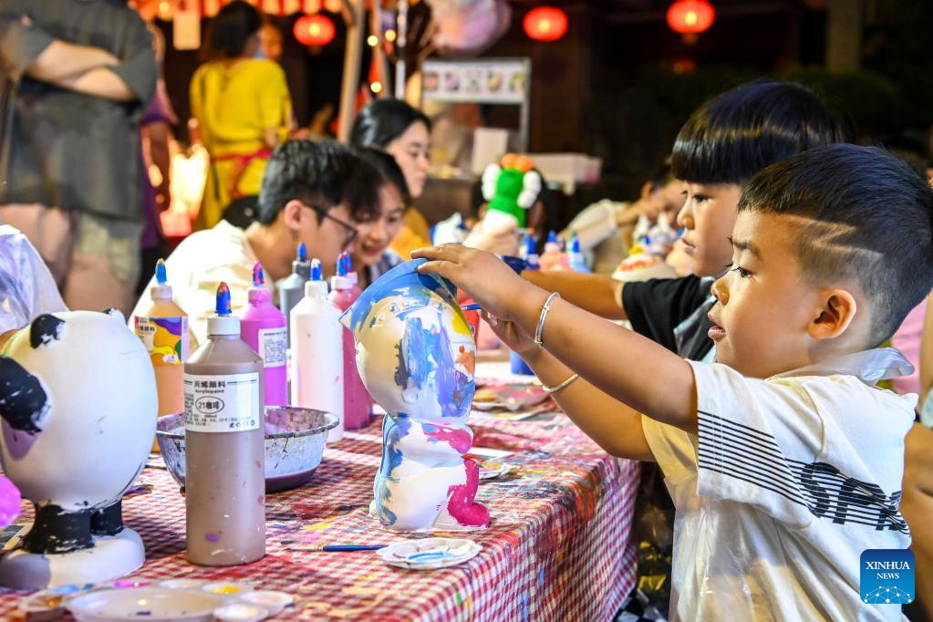 E-mail Xinhua, October 7, 2022Kids color plaster statues at a night fair in Nanning, south China's Guangxi Zhuang Autonomous Region, Oct. 1, 2022. Various nightlife activities enrich people's leisure time during the National Day holiday. (Xinhua/Cao Yiming)