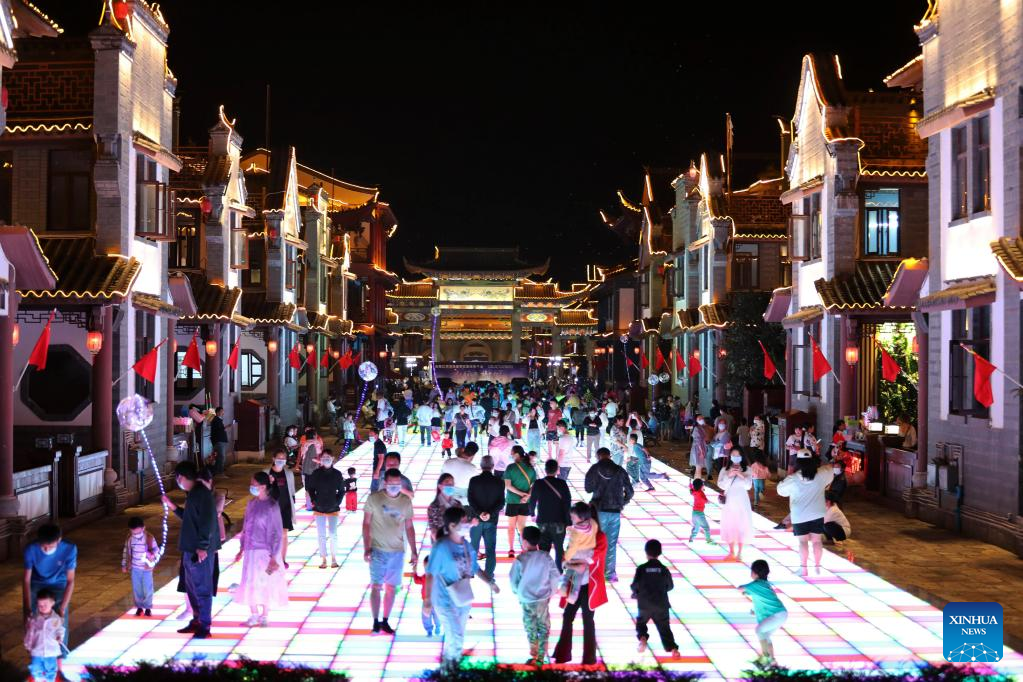 E-mail Xinhua, October 7, 2022Tourists have fun at a commercial town in Mengzi, southwest China's Yunnan Province, Oct. 5, 2022. Various nightlife activities enrich people's leisure time during the National Day holiday. (Photo by Wang Yu/Xinhua)
