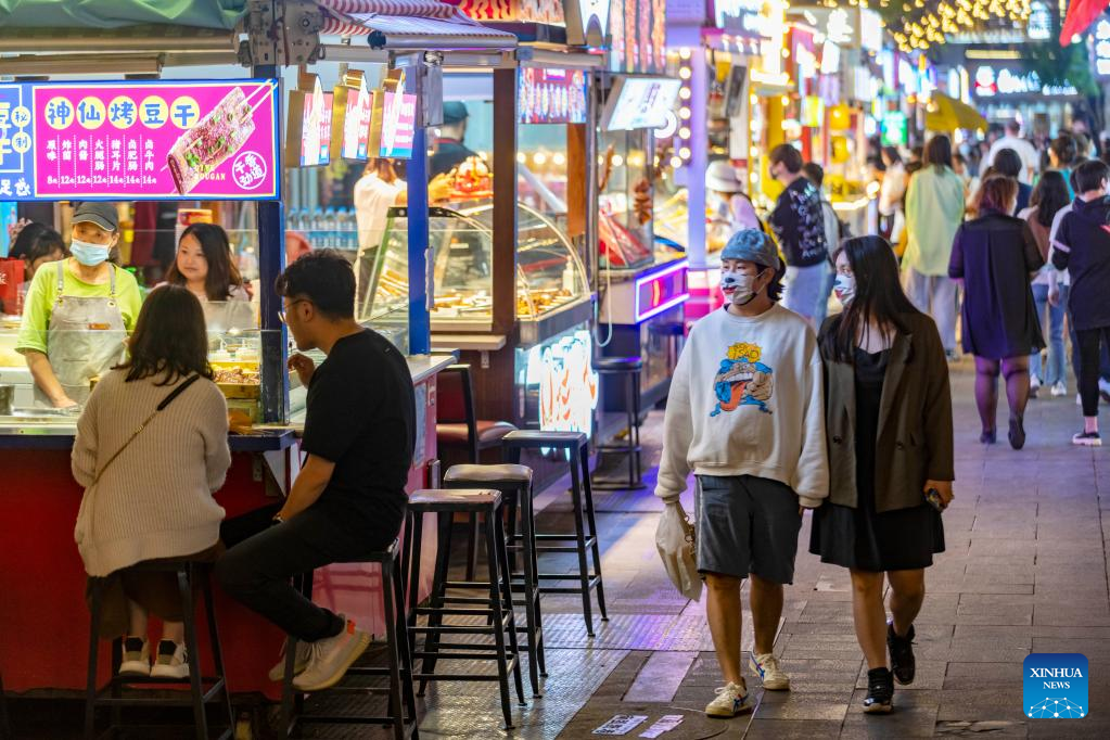 E-mail Xinhua, October 7, 2022Tourists visit Nanqiang Street in Kunming, southwest China's Yunnan Province, Oct. 5, 2022. Various nightlife activities enrich people's leisure time during the National Day holiday. (Xinhua/Chen Xinbo)