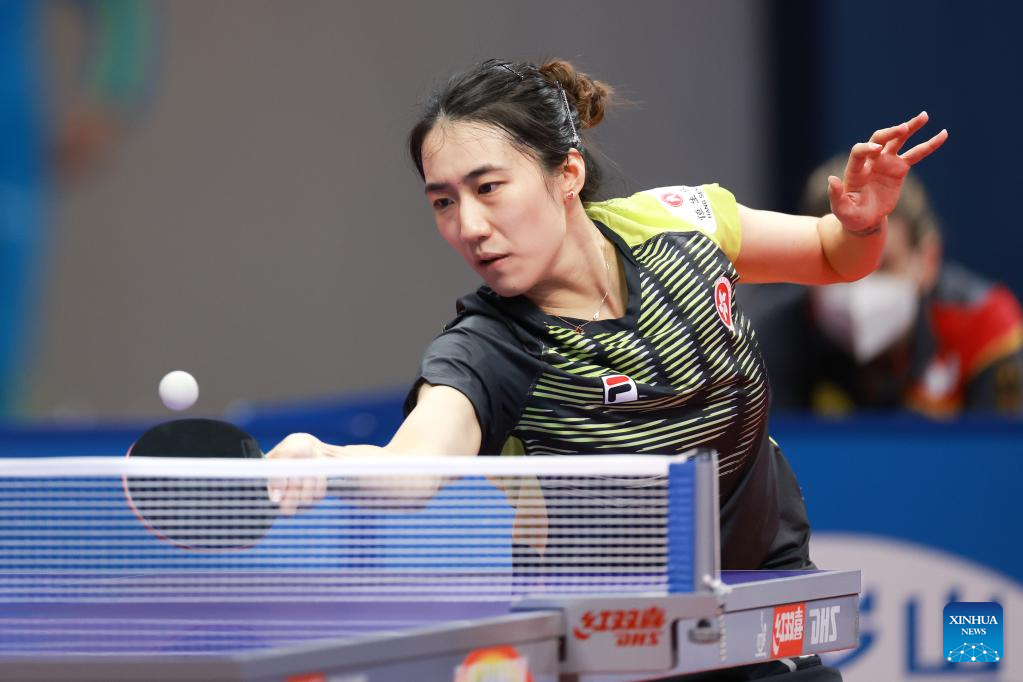 E-mail , October 7, 2022Zhu Chengzhu of China's Hong Kong hits a return during the women's teams quarterfinal against Nina Mittelham of Germany at the 2022 ITTF World Team Table Tennis Championships Finals in Chengdu, southwest China's Sichuan Province, Oct. 6, 2022. (Xinhua/Liu Xu)