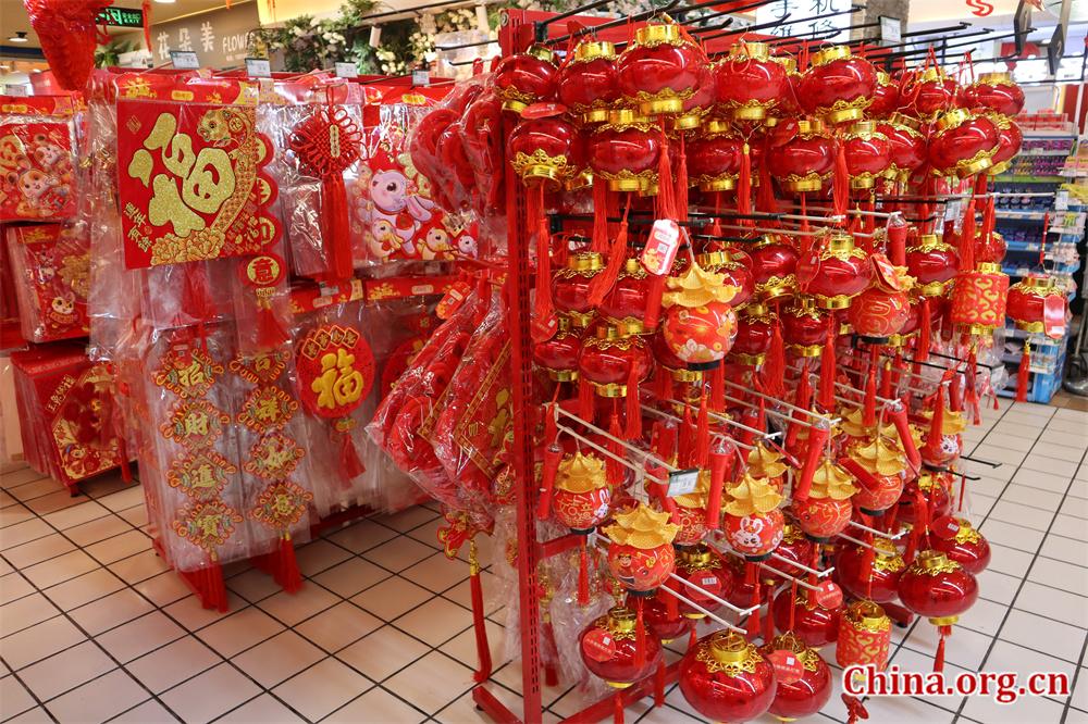Red lanterns and Spring Festival couplets for sale at a shopping mall in Beijing, Jan. 11, 2023. [Photo by Yan Bin/China.org.cn]