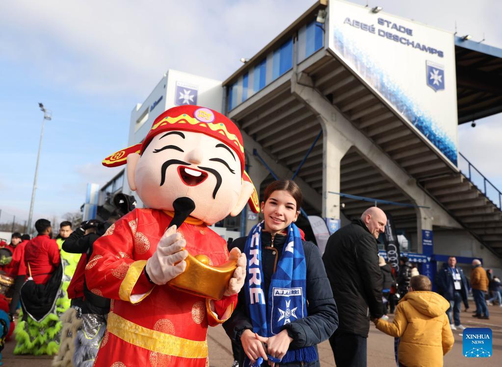 E-mail Xinhua, January 31, 2023An Auxerre fan poses with a performer dressed up as god of fortune outside the Abbe Deschamps Stadium of Auxerre club before a French Ligue 1 match between Auxerre and Montpellier as part of the Day of China activites to celebrate the Chinese Lunar New Year in Auxerre, France, Jan. 29, 2023. (Xinhua/Gao Jing)