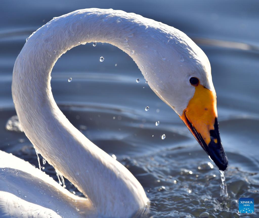 E-mail Xinhua, February 24, 2023A swan forages in Hongcun Village, Bajiazi Township, Beipiao of northeast China's Liaoning Province, Feb. 21, 2023. Thanks to the improvement of water quality and people's awareness of animal protection, the number of swans overwintering here has increased from over 40 to more than 400 since 2011. And the swans also attract tourists to the river bank. (Xinhua/Yang Qing)