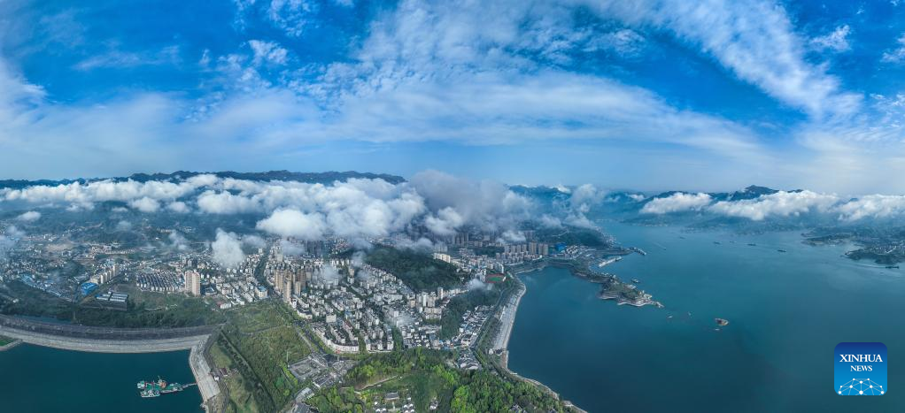 This aerial panorama photo taken on April 6, 2023 shows ships sailing in the upstream waters of the Three Gorges Dam in Zigui County of Yichang City, central China's Hubei Province. (Photo by Zheng Jiayu/Xinhua)