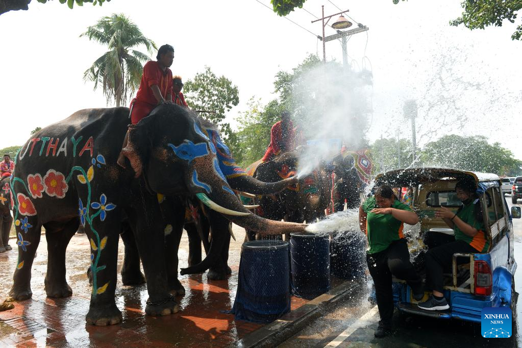 E-mail Xinhua, April 13, 2023Elephants spray water on tourists during a celebration for the upcoming Songkran Festival, in Ayutthaya, Thailand, April 11, 2023. Songkran Festival, the traditional Thai New Year, is celebrated from April 13 to 15 every year, during which people express greetings by splashing water on each other. (Xinhua/Rachen Sageamsak)
