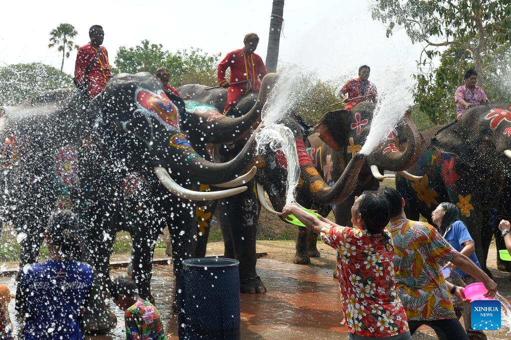 Elephants and tourists splash water on each other during a celebration for the upcoming Songkran Festival, in Ayutthaya, Thailand, April 11, 2023. Songkran Festival, the traditional Thai New Year, is celebrated from April 13 to 15 every year, during which people express greetings by splashing water on each other. (Xinhua/Rachen Sageamsak)