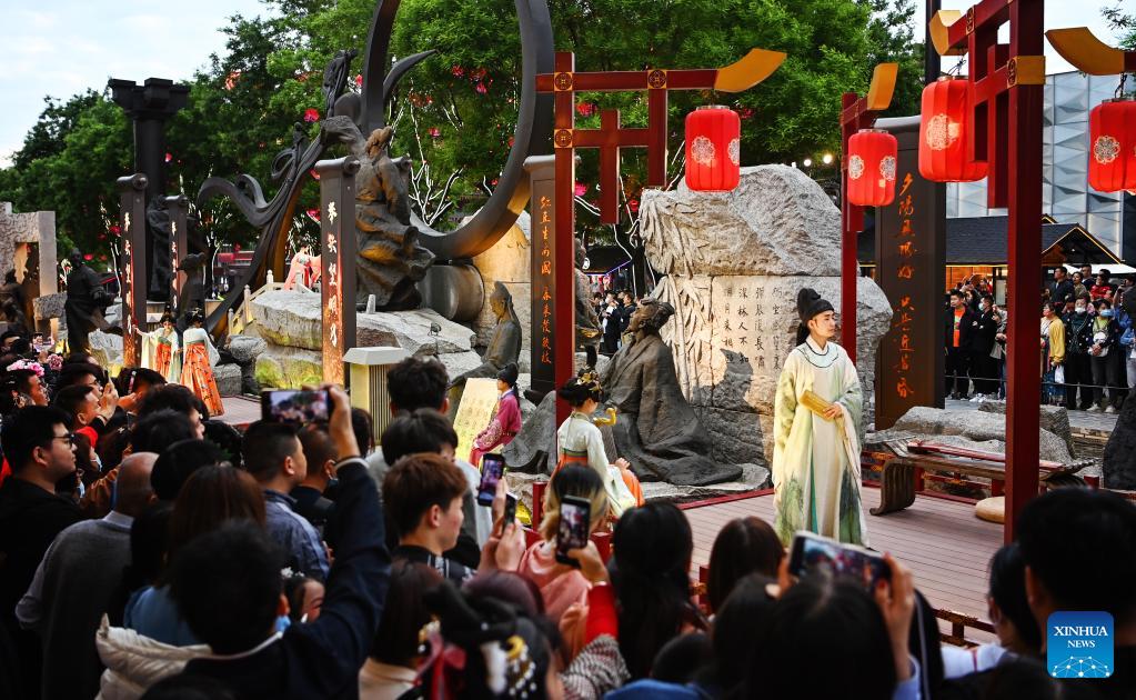 E-mail Xinhua, May 12, 2023Tourists watch a performance at the Datang Everbright City scenic area in Xi'an, northwest China's Shaanxi Province, May 8, 2023. Xi'an, a city with over 3,100 years of history, served as the capital for 13 dynasties in Chinese history. It is also home to the world-renowned Terracotta warriors created in the Qin Dynasty (221-207 BC). The Datang Everbright City, a tourist landmark of Xi'an featuring a grand street with characteristics of Tang Dynasty (618-907), has a total length of 2,100 meters from north to south and spans 500 meters wide from east to west. (Photo by Zou Jingyi/Xinhua)