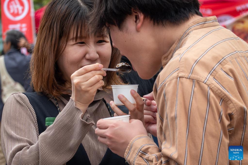 People sample snacks during a Sichuan food festival held at Nakano Central Park, Tokyo, Japan, on May 14, 2023. The Sichuan food festival was held here from May 13 to May 14. (Xinhua/Zhang Xiaoyu)