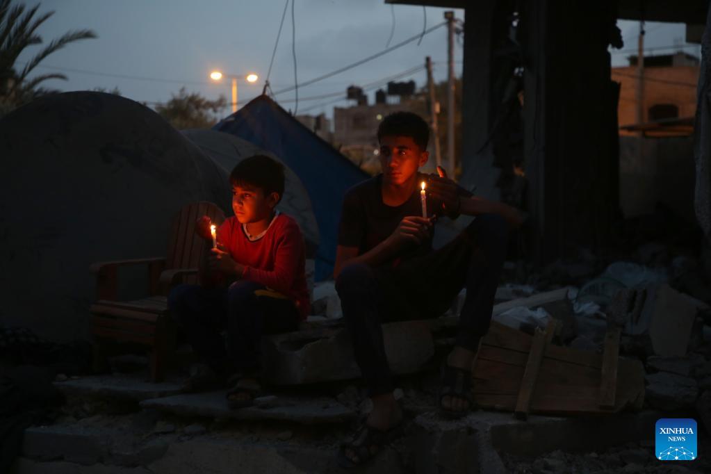 Palestinian children hold candles as they sit on ruins of a house destroyed during Israeli airstrikes in the southern Gaza Strip city of Rafah on May 14, 2023. The five-day confrontation started after an Israeli airstrike on Tuesday killed three senior PIJ leaders in the Gaza Strip. During the fightings, Israel launched hundreds of airstrikes, killing at least 33 Palestinians and injuring more than 150 others, according to the Gaza-based Health Ministry. (Photo by Khaled Omar/Xinhua)