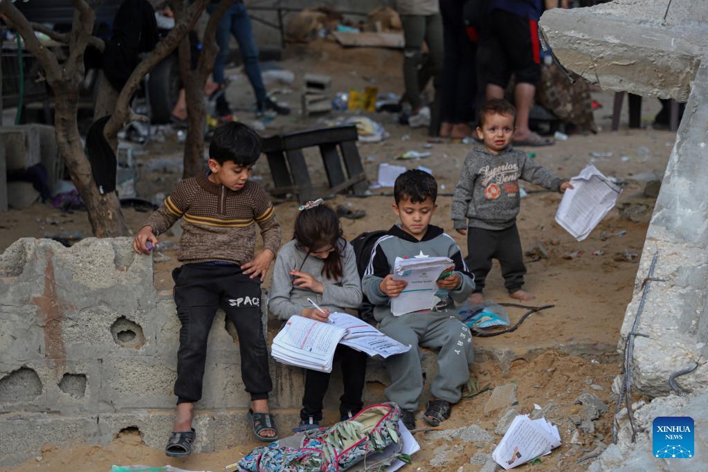 E-mail Xinhua, May 15, 2023Children sit on ruins of a house after it was destroyed in an airstrike in the northern Gaza Strip town of Beit Lahia on May 14, 2023. The five-day confrontation started after an Israeli airstrike on Tuesday killed three senior PIJ leaders in the Gaza Strip. During the fightings, Israel launched hundreds of airstrikes, killing at least 33 Palestinians and injuring more than 150 others, according to the Gaza-based Health Ministry. (Photo by Rizek Abdeljawad/Xinhua)