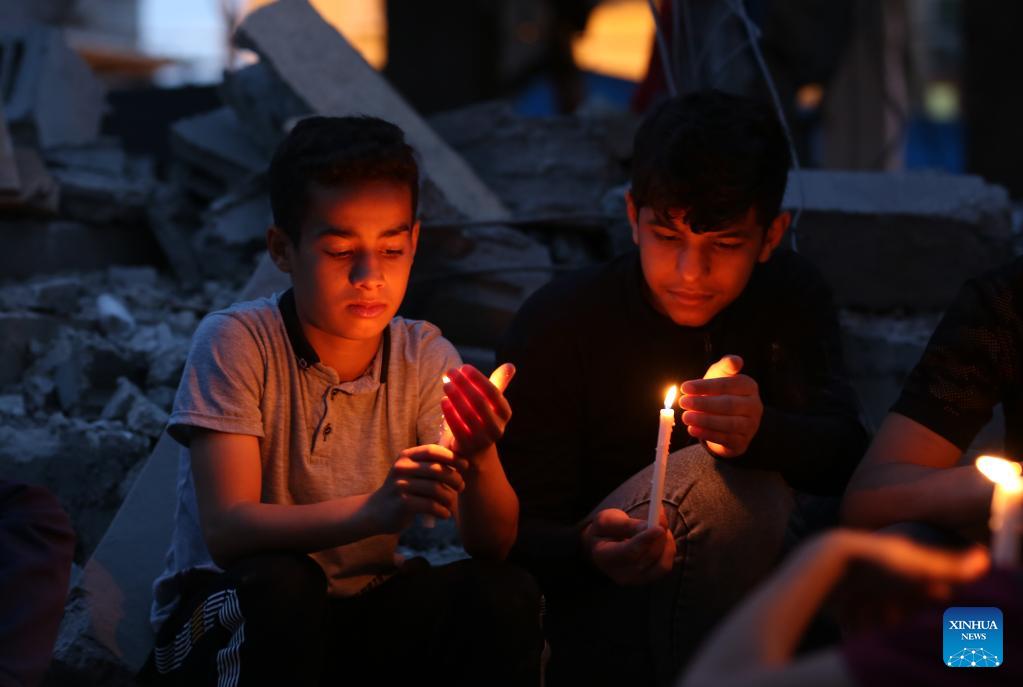 E-mail Xinhua, May 15, 2023Palestinian children hold candles as they sit on ruins of a house destroyed during Israeli airstrikes in the southern Gaza Strip city of Rafah on May 14, 2023. The five-day confrontation started after an Israeli airstrike on Tuesday killed three senior PIJ leaders in the Gaza Strip. During the fightings, Israel launched hundreds of airstrikes, killing at least 33 Palestinians and injuring more than 150 others, according to the Gaza-based Health Ministry. (Photo by Khaled Omar/Xinhua)