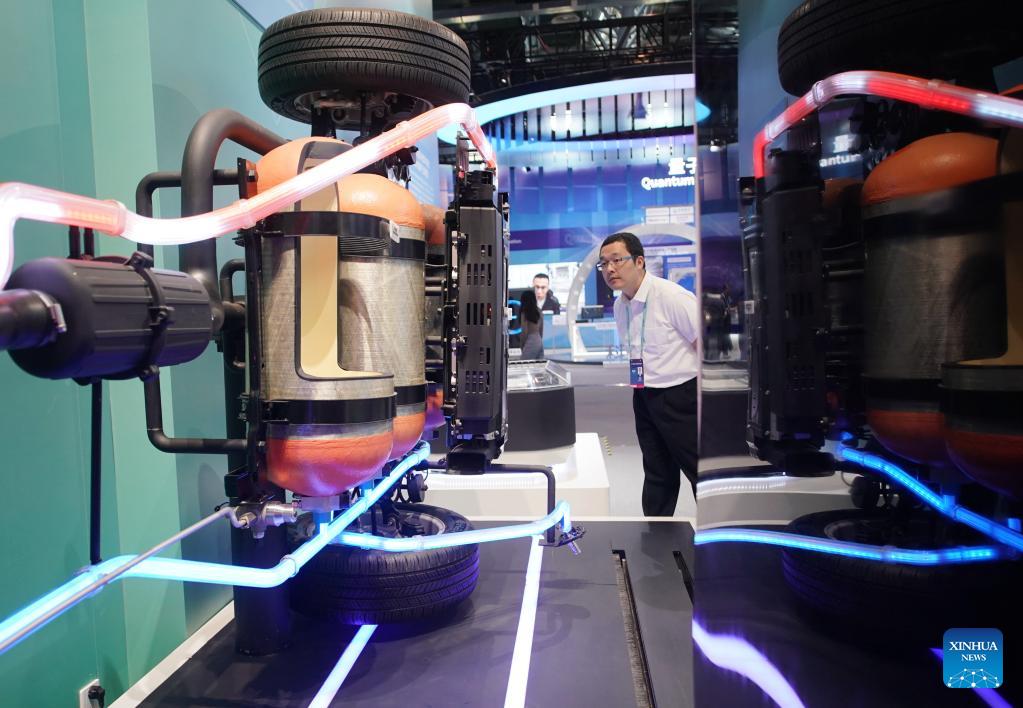 E-mail Xinhua, May 28, 2023This photo taken on May 27, 2023 shows a Hyundai hydrogen fuel cell vehicle for display at the exhibition center of Zhongguancun National Independent Innovation Demonstration Zone in Beijing, capital of China. New energy vehicles and relevant products take the spotlight at this year's Zhongguancun Forum (ZGC Forum). (Xinhua/Zhang Chenlin)