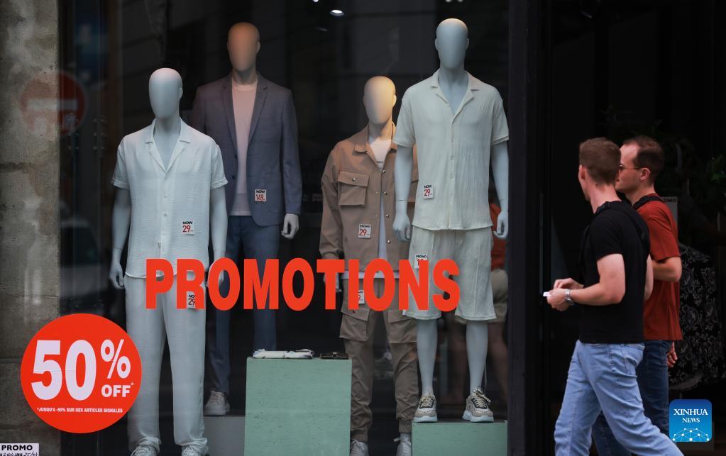 People walk past summer sales' signs in Paris, France, on June 28, 2023. Summer sales in Paris kicked off on Wednesday and will last till July 25. (Xinhua/Gao Jing)