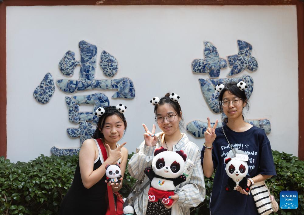 E-mail Xinhua, July 24, 2023Tourists pose for photos with Rongbao, mascot of the Chengdu Universiade, in Chengdu, southwest China's Sichuan province, July 19, 2023. The 31st International University Sports Federation (FISU) Summer World University Games will be held in Chengdu from July 28 to August 8. (Xinhua/Jiang Hongjing)