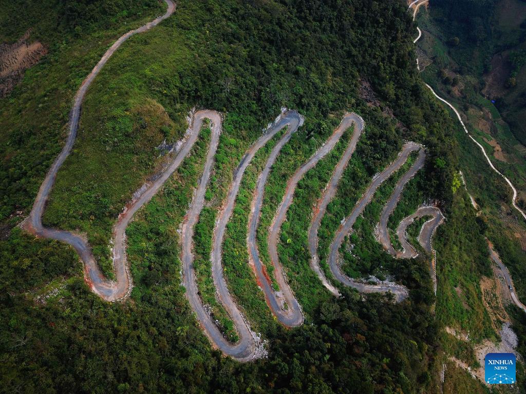 E-mail Xinhua, August 2, 2023This aerial photo taken on March 18, 2018 shows the construction site of a winding mountain road in Napo County, south China's Guangxi Zhuang Autonomous Region. Napo County belongs to the mountainous areas of Guangxi. In recent years, several winding mountain roads have been built to make it more convenient for local villagers to travel and to promote local economic growth at the same time. (Xinhua/Zhang Ailin)