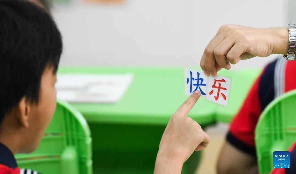 E-mail Xinhua, September 11, 2023Fu Yaohui teaches a student to read at Hainan (Haikou) Special School in Haikou, south China's Hainan Province, Sept. 6, 2023. Fu Yaohui is a teacher at the special education school in Haikou. Since 2004, Fu has been engaged in special education for students with intellectual disabilities, cultivating their basic skills to adapt to life. Every day, Fu arrives at school early and accompanies the students with patience and encouragement. "I want my students to be self-reliant," she said. In order to achieve this goal, she tries her best to help these children, so that they can succeed in their studies and better integrate into society. (Xinhua/Yang Guanyu)