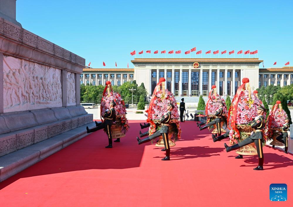 A ceremony presenting flower baskets to fallen national heroes to mark the Martyrs' Day is held in Tian'anmen Square in Beijing, capital of China, Sept. 30, 2023.