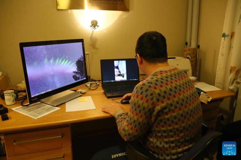 E-mail Xinhua, November 28, 2023Li Bin, a deputy researcher at the Polar Research Institute of China, has a video chat with his wife and son at the Yellow River Station in Ny-Alesund, Svalbard, Norway, Nov. 12, 2023. (Xinhua/Zhang Yuliang)