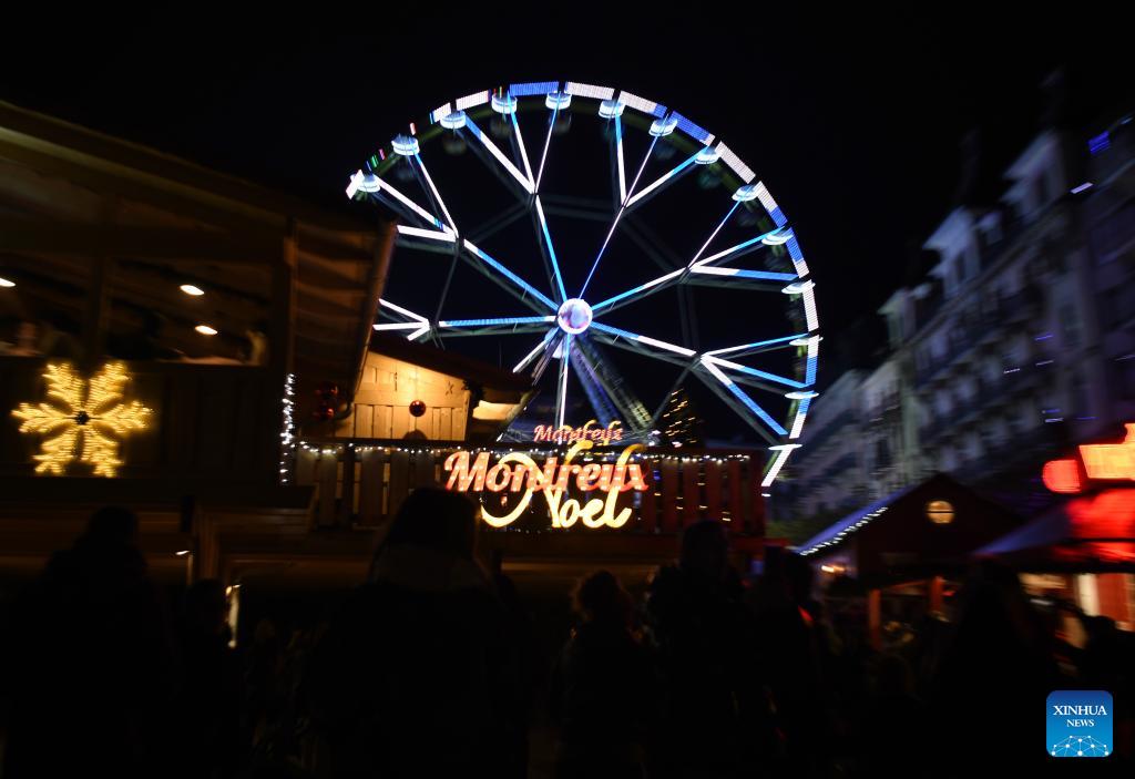 This photo taken on Dec. 2, 2023 shows a view of the lakeside Christmas market in Montreux, Switzerland. The lakeside Christmas market in Montreux is one of the most famous of its kind in the country. (Xinhua/Lian Yi)