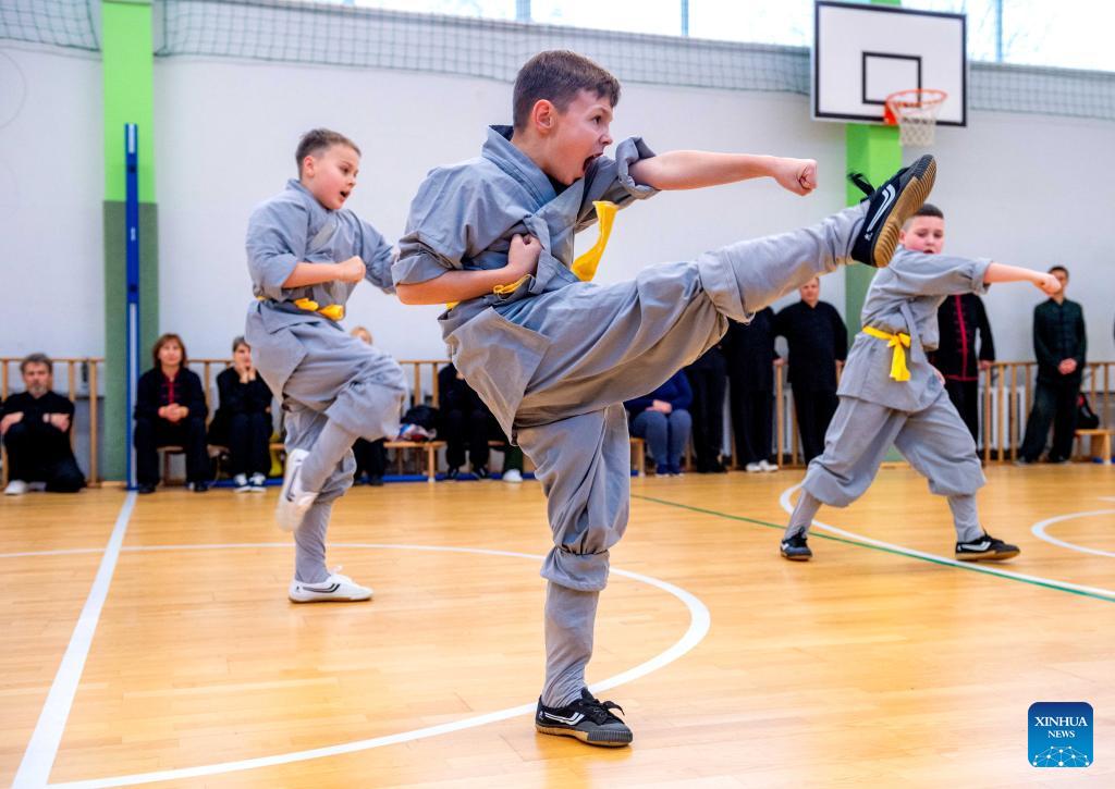 Participants perform at the Chinese Wushu (Kung Fu) and Tai Chi Performance Competition held by Lithuanian Wushu Federation in Vilnius, Lithuania, Dec. 9, 2023. (Photo by Alfredas Pliadis/Xinhua)