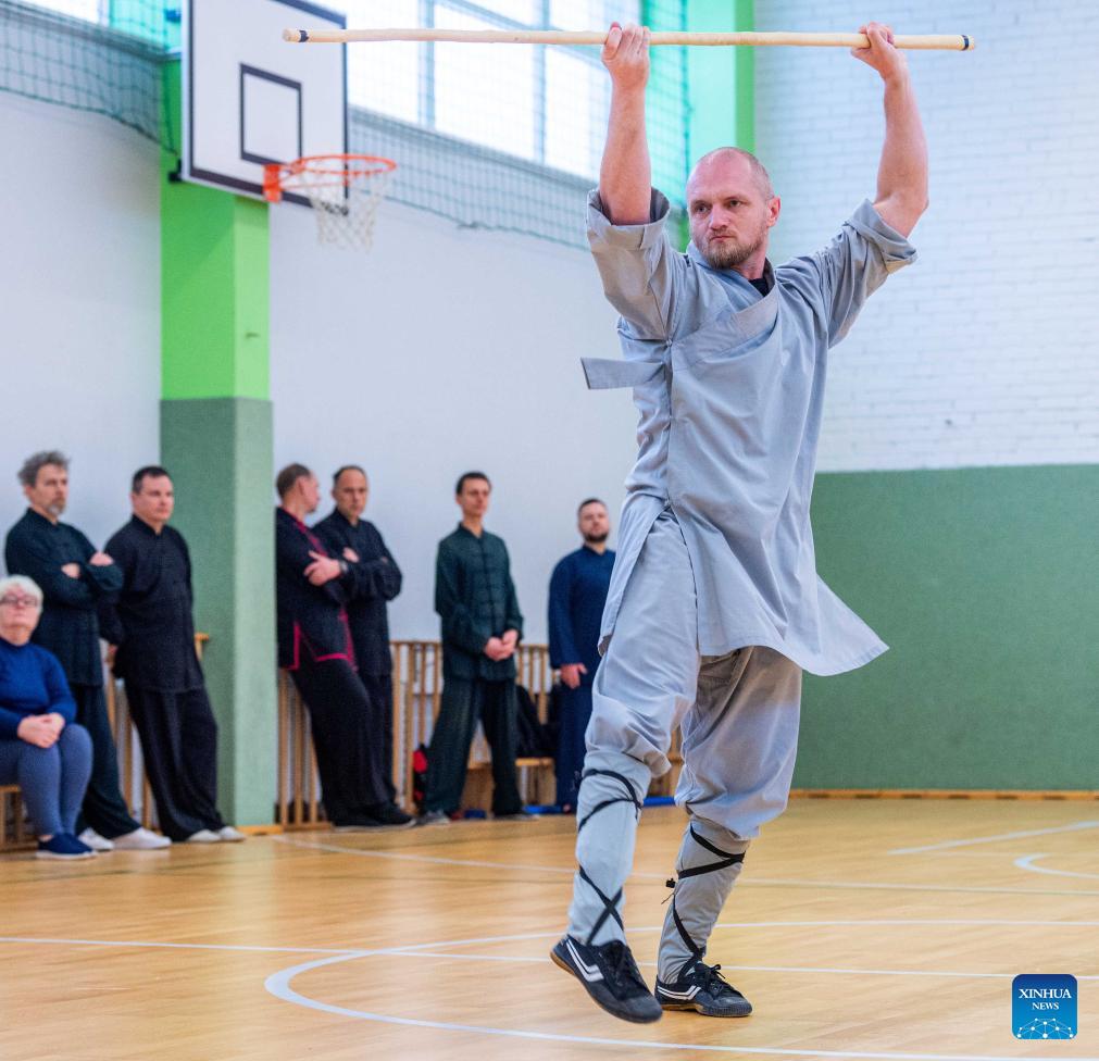 A participant performs at the Chinese Wushu (Kung Fu) and Tai Chi Performance Competition held by Lithuanian Wushu Federation in Vilnius, Lithuania, Dec. 9, 2023. (Photo by Alfredas Pliadis/Xinhua)