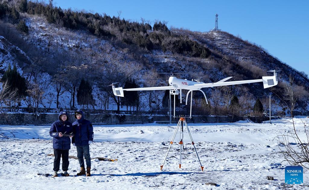 E-mail Xinhua, December 18, 2023Staff workers of power supply company operate a drone to patrol power lines in Beijing, capital of China, Dec. 17, 2023. Countermeasures have been taken to prevent or alleviate impacts inflicted by extensive snowfall and other freezing conditions. (Xinhua/Li Xin)