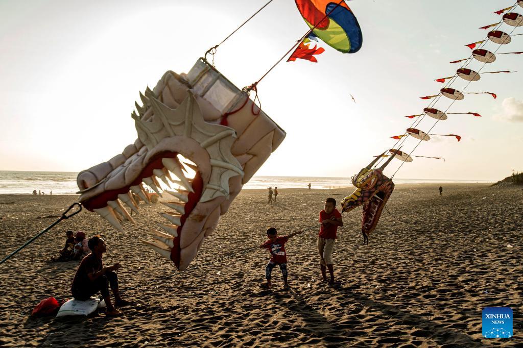 People fly dragon kites at Parangkusumo beach in Bantul district, Yogyakarta, Indonesia, on Dec. 17, 2023. A dragon kite community in Yogyakarta flied 25 dragon kites on Sunday to attract tourists to visit the Parangkusumo beach for the upcoming Christmas and New Year holiday. (Photo by Agung Supriyanto/Xinhua)