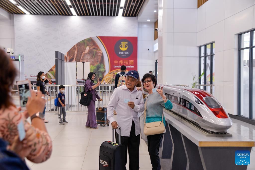 E-mail Xinhua, December 18, 2023Passengers pose for photos with a model of a high-speed electrical multiple unit (EMU) train of the Jakarta-Bandung high-speed railway at Halim Station in Jakarta, Indonesia, Dec. 17, 2023. According to PT Kereta Cepat Indonesia-China (KCIC), a joint venture consortium between Indonesian and Chinese state-owned firms that constructs and runs the Jakarta-Bandung high-speed railway (HSR), the HSR has delivered more than 700,000 passengers since it was officially put into commercial operation on Oct. 17. (Xinhua/Xu Qin)