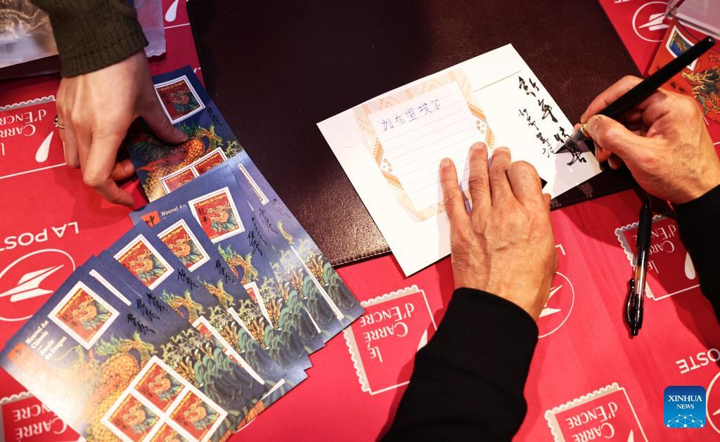 E-mail Xinhua, January 28, 2024Chen Jianghong, a French artist of Chinese origin who designed a pair of stamps to celebrate the upcoming Chinese Lunar New Year, signs for a philatelist in Paris, France, Jan. 26, 2024. France's La Poste Group unveiled a pair of stamps on Friday to celebrate the upcoming Chinese Lunar New Year, the Year of the Dragon.