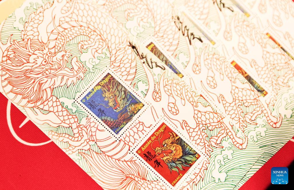 This photo taken on Jan. 26, 2024 shows a pair of stamps issued by La Poste Group to celebrate the upcoming Chinese Lunar New Year in Paris, France. France's La Poste Group unveiled a pair of stamps on Friday to celebrate the upcoming Chinese Lunar New Year, the Year of the Dragon.