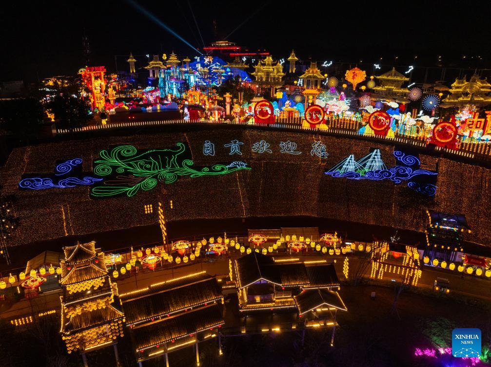 An aerial drone photo taken on Jan. 26, 2024 shows light installations for an upcoming lantern show in Zigong, southwest China's Sichuan Province. The city of Zigong is well known for the large number of dinosaur fossils that have been unearthed in past decades.