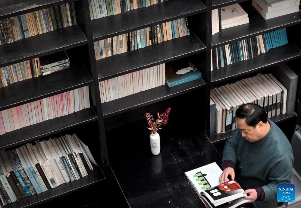 E-mail Xinhua, January 28, 2024Liu Xiaoqiang reads at his studio in Zhenping County of Nanyang City, central China's Henan Province, Jan. 23, 2024. The Zhenping jade carving is a traditional folk art originated from Zhenping County, with Dushan jade as its primary raw material. Through more than 10 procedures, ranging from material selection, designing to carving, the raw jade is ultimately transformed into exquisite artwork that strike a delicate harmony between the natural beauty of the raw jade and its given form.