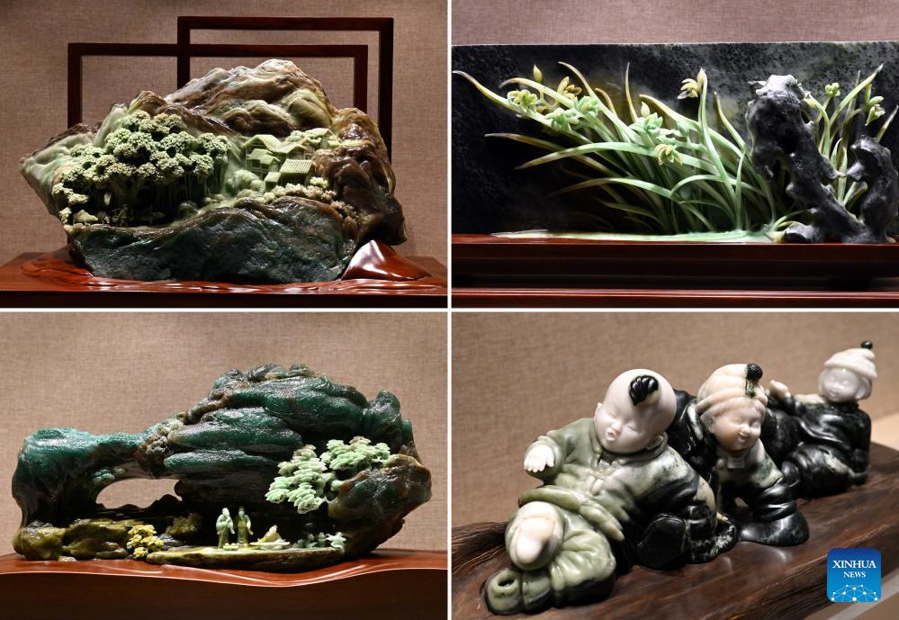 E-mail Xinhua, January 28, 2024This combo photo taken on Jan. 23, 2024 shows jade carving artworks displayed at the exhibition room of Liu Xiaoqiang's studio in Zhenping County of Nanyang City, central China's Henan Province, Jan. 23, 2024. The Zhenping jade carving is a traditional folk art originated from Zhenping County, with Dushan jade as its primary raw material. Through more than 10 procedures, ranging from material selection, designing to carving, the raw jade is ultimately transformed into exquisite artwork that strike a delicate harmony between the natural beauty of the raw jade and its given form.