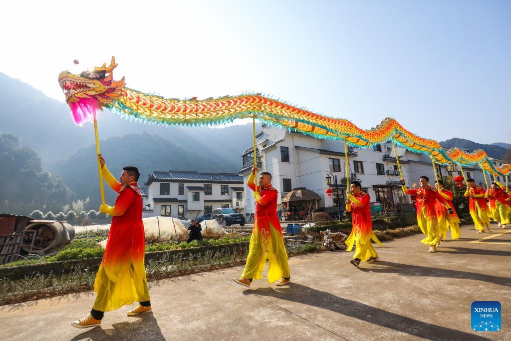E-mail Xinhua, January 29, 2024People perform dragon dance during a Chinese New Year culture festival in Lianhua Town of Jiande City, east China's Zhejiang Province, Jan. 28, 2024. A culture festival celebrating the upcoming Chinese New Year is held in Lianhua Town on Sunday. Tourists enjoyed watching traditional performances while having delicacies at a large open-air banquet consisted of 100 tables amid a bustling and festive atmosphere. (Xinhua/Xu Yu)