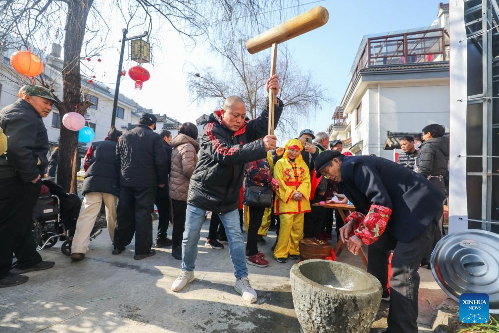 E-mail Xinhua, January 29, 2024A man makes maci, a local snack made from sticky rice, during a Chinese New Year culture festival in Lianhua Town of Jiande City, east China's Zhejiang Province, Jan. 28, 2024. A culture festival celebrating the upcoming Chinese New Year is held in Lianhua Town on Sunday. Tourists enjoyed watching traditional performances while having delicacies at a large open-air banquet consisted of 100 tables amid a bustling and festive atmosphere. (Xinhua/Xu Yu)