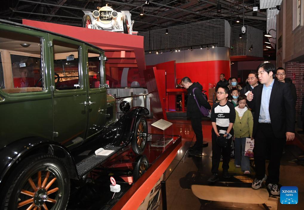 A staff member introduces to children and their parents a vehicle collected by Beijing Auto Museum at the museum in Beijing, capital of China, Jan. 28, 2024. Many children visit Beijing Auto Museum with their parents during this winter vacation to attend popular-science lectures and learn about automobile knowledge. (Xinhua/Ren Chao)