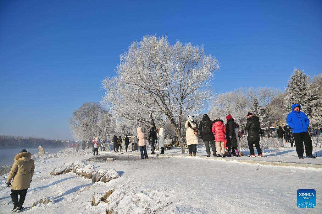 E-mail Xinhua, January 29, 2024Tourists enjoy the rime scenery along a river in Jilin City, northeast China's Jilin Province, on Jan. 26, 2024. Boasting abundant ice and snow resources, Jilin Province in northeast China continues to optimize its tourism service to gain prominence as one of the most popular winter destinations for tourists. (Xinhua/Chen Yehua)