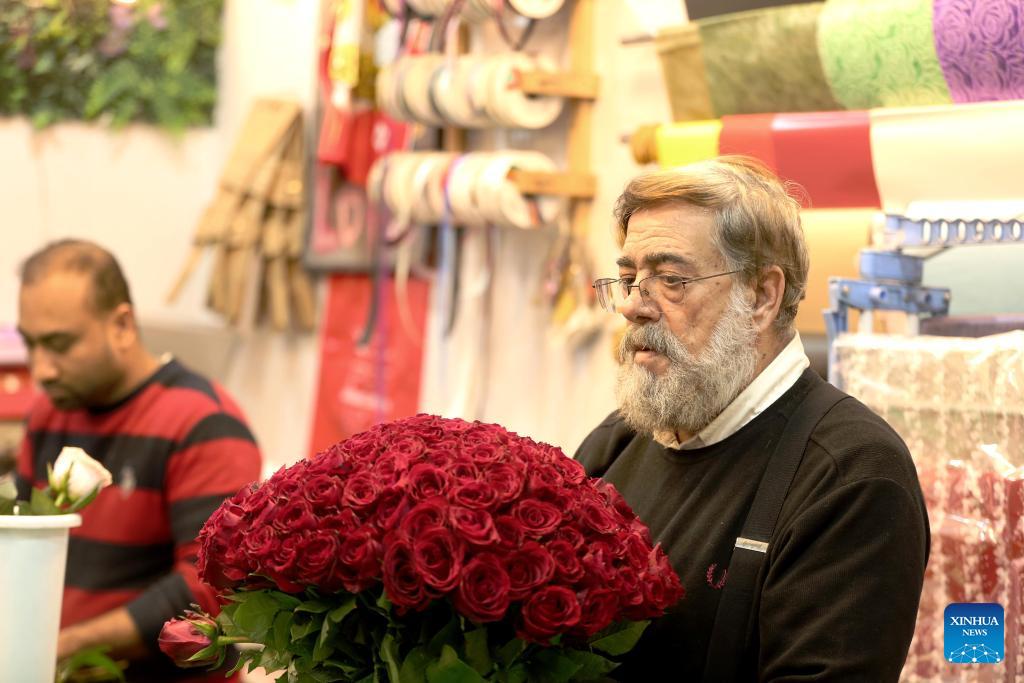 (240214) -- BAGHDAD, Feb. 14, 2024 (Xinhua) -- A vendor displays a bouquet of roses in his shop on Valentine's Day in Baghdad, Iraq, Feb. 14, 2024. (Xinhua/Khalil Dawood)