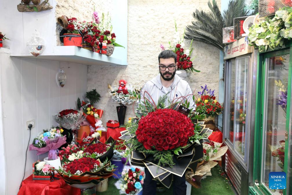 (240214) -- BAGHDAD, Feb. 14, 2024 (Xinhua) -- A man holds a bouquet of roses on Valentine's Day in a shop in Baghdad, Iraq, Feb. 14, 2024. (Xinhua/Khalil Dawood)