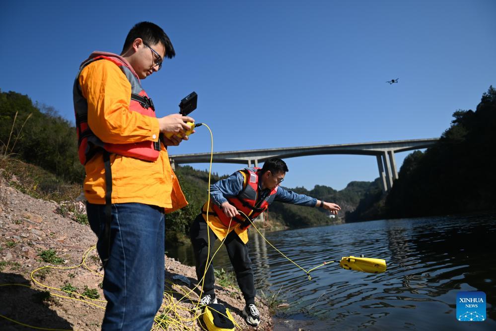 Technicians operate an unmanned submersible for checking piers of a bridge of Chengdu-Guiyang High-Speed Railway in Guiyang, southwest China's Guizhou Province, Feb. 19, 2024. Many high-tech products including unmanned submersibles have been applied to ensure smooth operation of railway lines during this year's Spring Festival travel rush which started on Jan. 26. (Xinhua/Liu Xu)