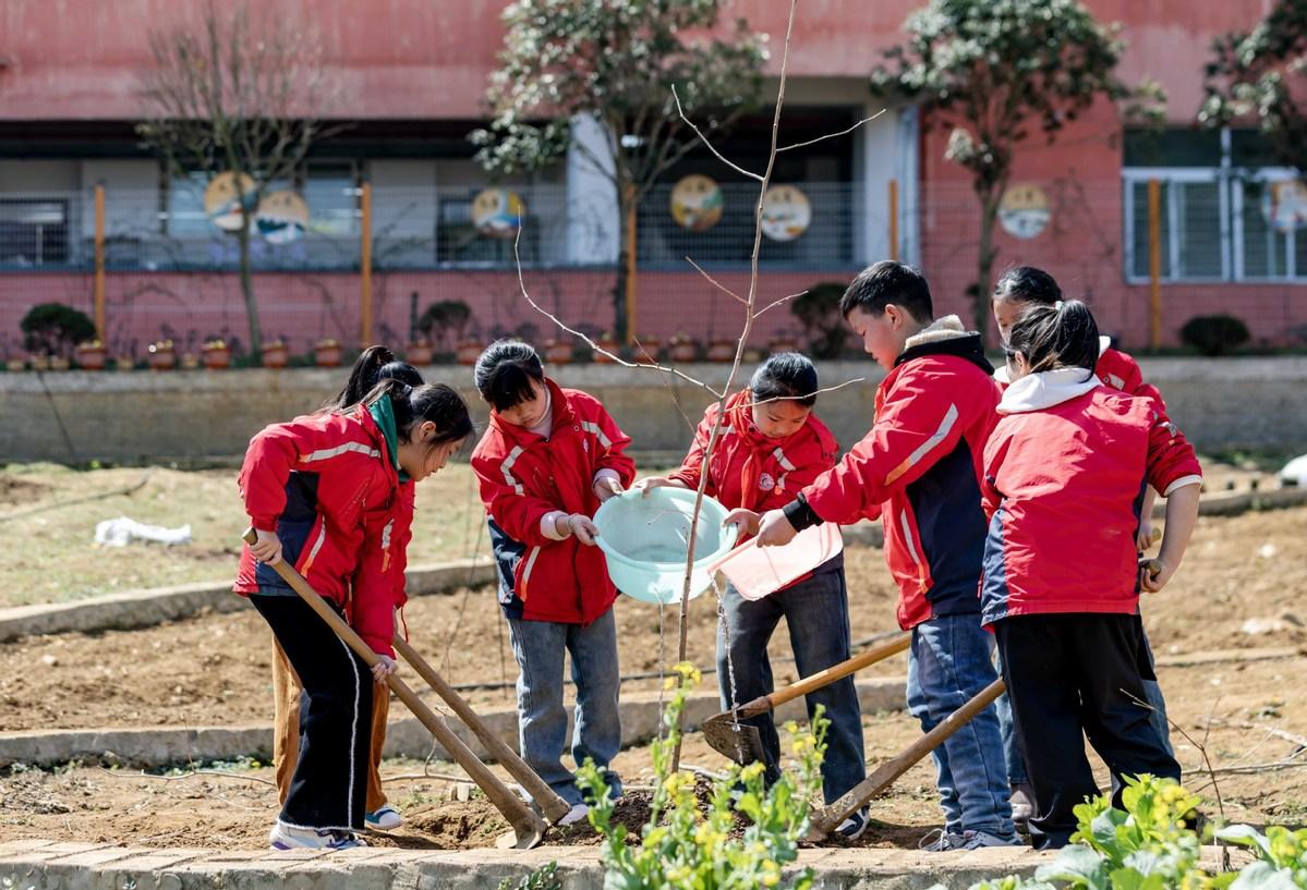 Students plant trees in Qianxi, Guizhou province, March 11, 2024. China on Tuesday celebrates its 46th National Tree Planting Day. [Photo/Xinhua]