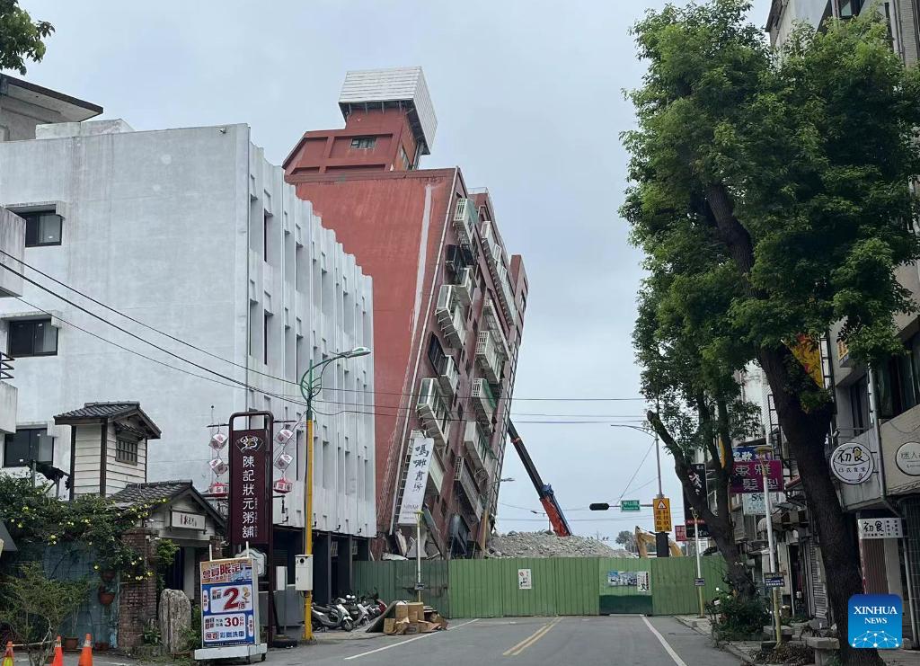 E-mail Xinhua, April 6, 2024This photo taken on April 5, 2024 shows a tilted building in downtown Hualien after a 7.3-magnitude earthquake in southeast China's Taiwan. The building will be demolished from top to bottom, starting with the front glass wall. A 7.3-magnitude earthquake jolted the sea area near Hualien County in Taiwan at 7:58 a.m. Wednesday (Beijing Time), followed by many aftershocks, according to the China Earthquake Networks Center. (Xinhua/Zhao Bo)