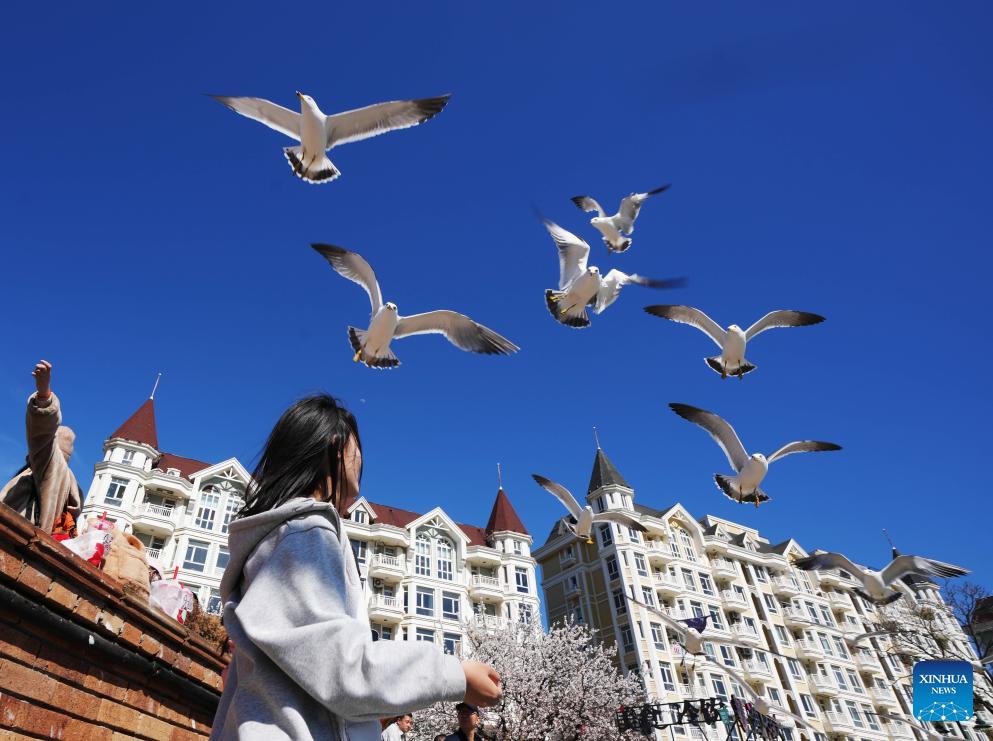 A tourist feeds birds at Laohutan scenic area in Dalian, northeast China's Liaoning Province, April 16, 2024. (Xinhua/Li Gang)