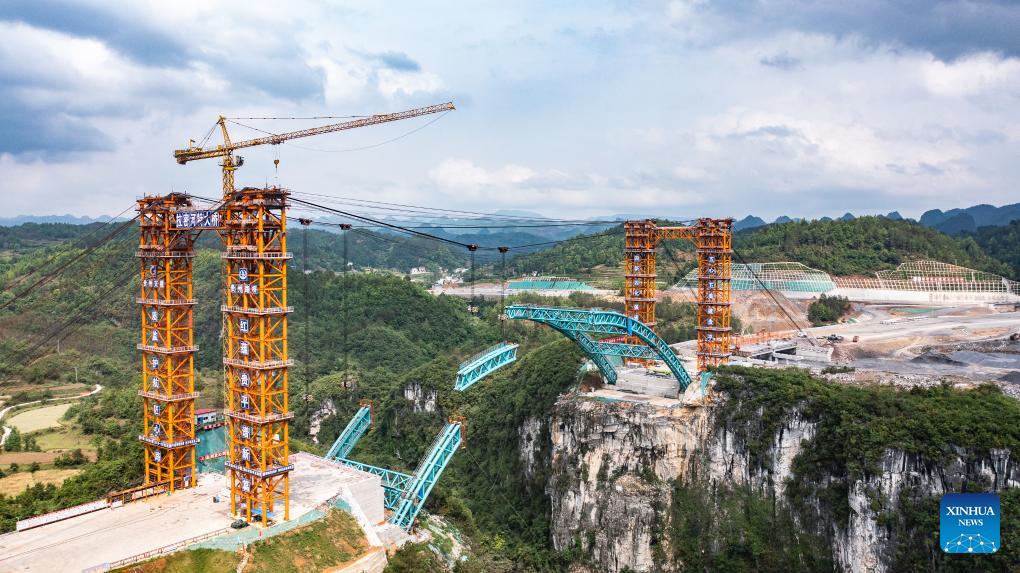 An aerial drone photo taken on April 18, 2024 shows the Lami River bridge along the Guiyang-Pingtang expressway under construction in southwest China's Guizhou Province. With a designed speed of 100 km per hour, the Guiyang-Pingtang expressway in Guizhou has a total length of 174.018 km. (Xinhua/Tao Liang)