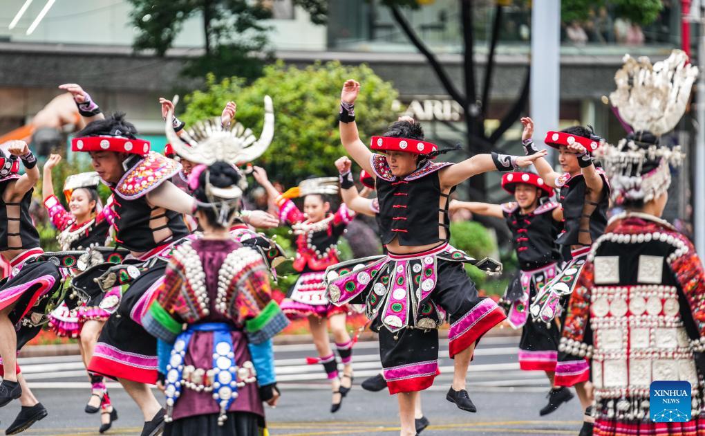 People dressed in ethnic costumes parade in a street in Guiyang, southwest China's Guizhou Province, May 18, 2024. More than 3,200 people participated in this event showcasing the ethnic cultures of Guizhou Province. (Xinhua/Tao Liang)