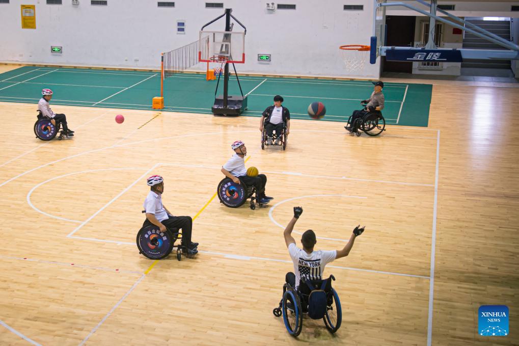 Disabled people play basketball at the gymnasium of Hezhuang cultural and sports center in Qiantang District of Hangzhou, east China's Zhejiang Province, May 16, 2024. (Xinhua/Jiang Han)
