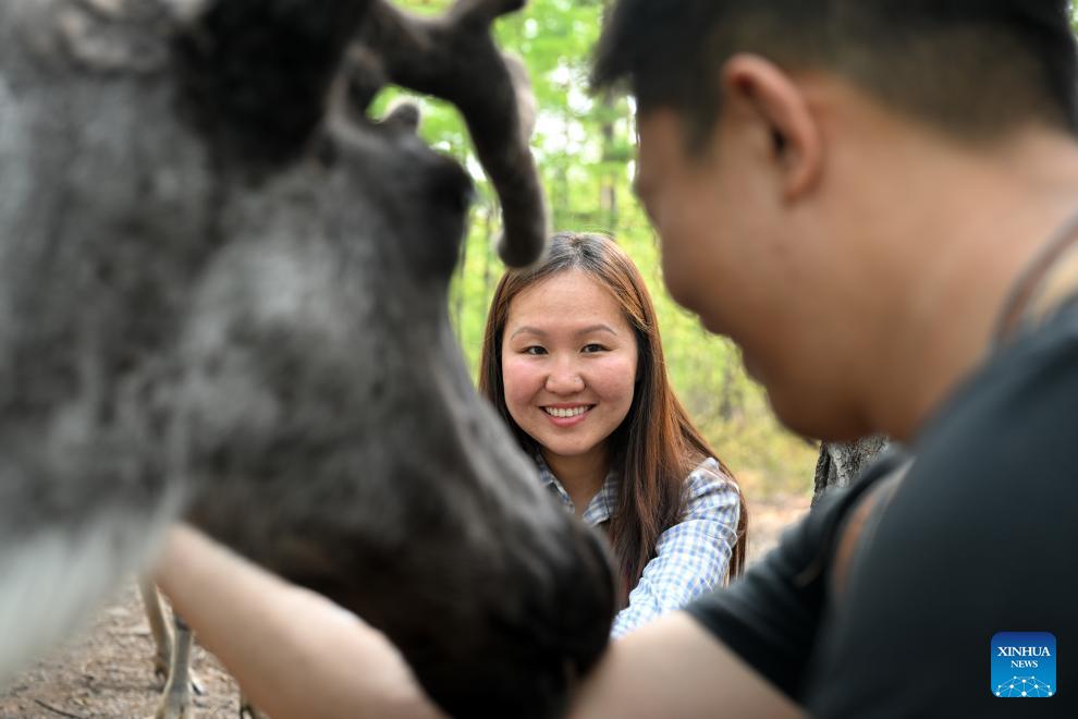 Ayousha watches as her husband Wu Qiming deworms a reindeer at the reindeer herding site in Jinhe Town of Genhe City, north China's Inner Mongolia Autonomous Region, July 3, 2024. (Xinhua/Bei He)