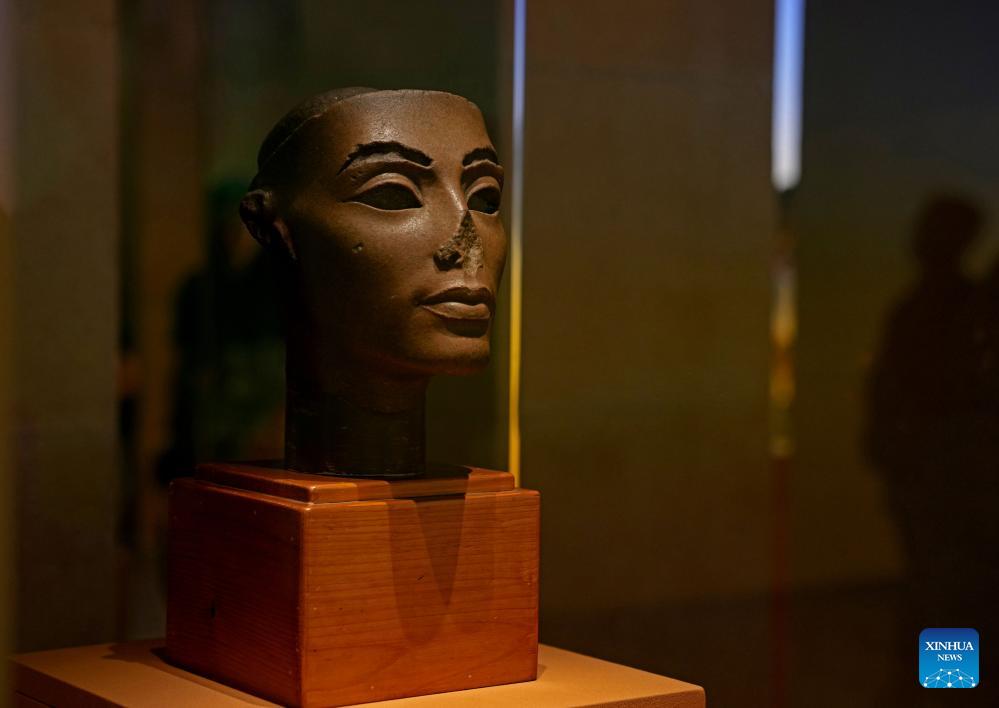 E-mail Xinhua, July 18, 2024This photo taken on July 17, 2024 shows the head from a statue of Nefertiti during a preview of the exhibition "On Top of the Pyramid: The Civilization of Ancient Egypt" at the Shanghai Museum in east China's Shanghai. The opening ceremony of the exhibition was held Wednesday at the Shanghai Museum on the People's Square of the city. The exhibition will be open to public on July 19, bringing Chinese visitors altogether 788 precious artifacts from different periods of ancient Egypt, most of which are being displayed in Asia for the first time. The exhibition will run until August 2025. (Xinhua/Liu Ying)